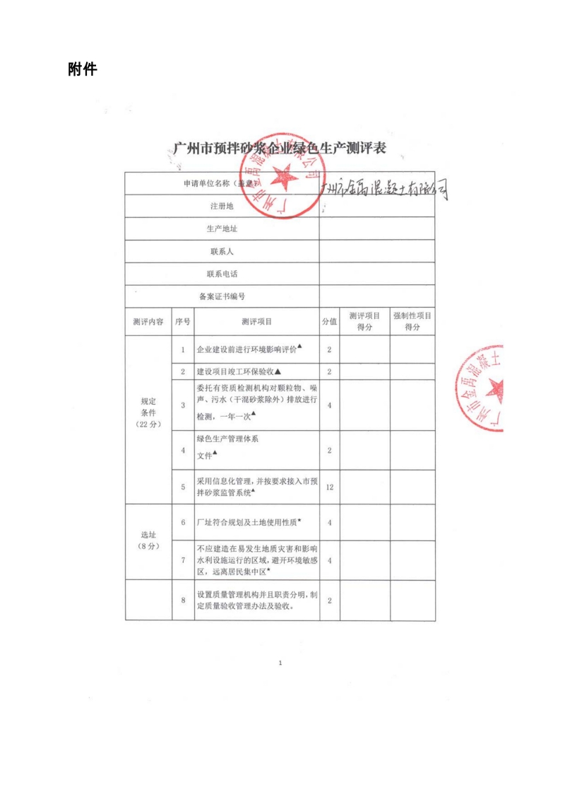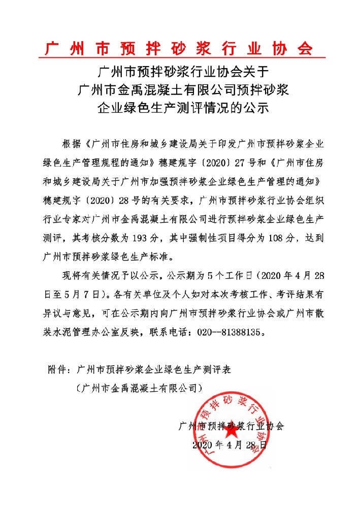广州市预拌砂浆行业协会关于广州市金禹混凝土有限公司预拌砂浆企业绿色生产测评情况的公示