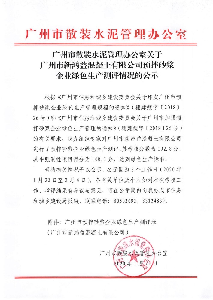 广州市散装水泥管理办公室关于广州市新鸿益混凝土有限公司预拌砂浆企业绿色生产测评情况的公示